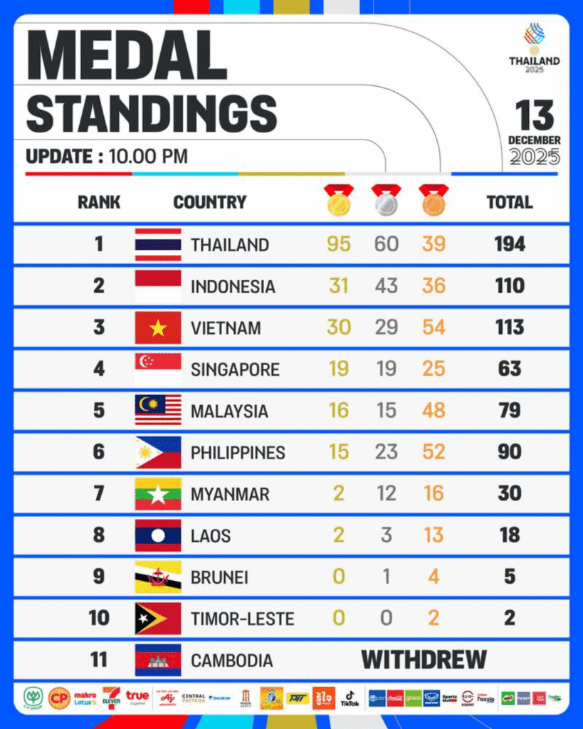 Di puncak klasemen, tuan rumah Thailand semakin menunjukkan dominasinya dan sulit dikejar. Negeri Gajah Putih kokoh di peringkat pertama dengan raihan 95 emas, 60 perak, dan 39 perunggu (total 194 medali).